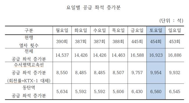 통합시 공급 좌석 증가분 ※ 토요일 자료를 기준으로 기타 요일의 공급 좌석수 증가분은 현행 코레일과 에스알 공급 좌석 비율과 동탄역 정차 열차비율을 적용하여 산정한 것임.