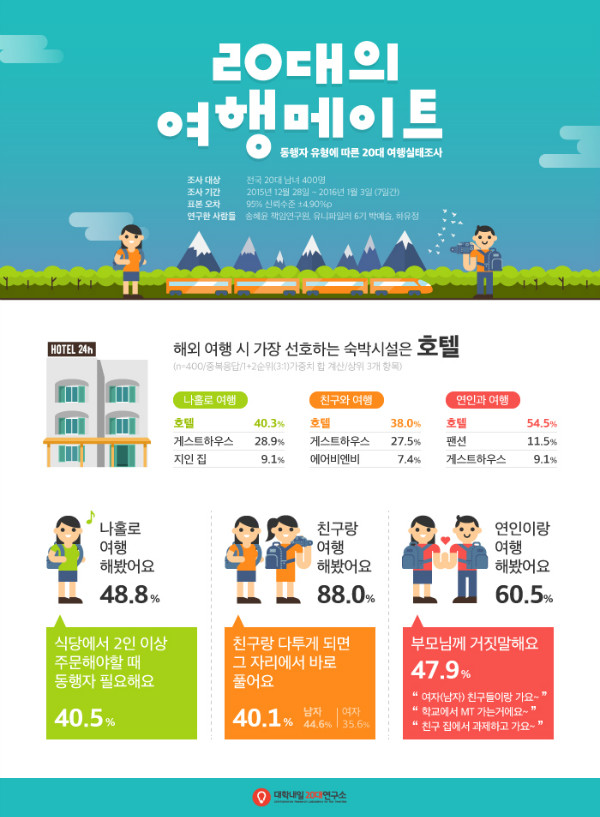 국내든 해외든 여행을 떠난다는 사실만으로 가슴이 벅차오르는 20대 청춘들. 열정 가득한 이들의 여행패턴을 알아보고자 대학내일20대연구소가 작년 12월부터 올 1월까지 전국 20대 400명을 대상으로 ‘동행자 유형에 따른 20대 여행실태조사’를 실시하였다. 본 조사의 경우 20대가 국내외 여행 시 함께 여행을 떠난 동행자별로 어떤 특징을 갖고 있는지 알아보기 위해 크게 나홀로 여행, 친구와의 여행, 연인과의 여행 3가지 유형으로 나누어 실시됐다.